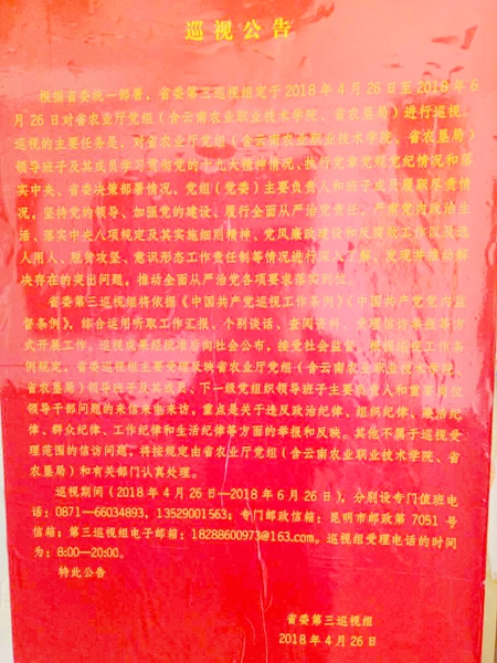 根据省委统一部署,省委第三巡视组定于2018年4月26日至2018年6月26日对省农业厅党组(含云南农业职业技术学院、省农垦局)进行巡视。巡视的主要任务是,对省农业厅党组(含云南农业职业技术学院、省农垦局)领导班子及其成员学习贯彻党的十九大精神情况、执行党章党规党纪情况和落实中央、省委决策部署情况,党组(党委)主要负责人和班子成员履职尽责情况,坚持党的领导、加强党的建设、履行全面从严治党责任,严肃党内政治生活、落实中央八项规定及其实施细则精神、党风廉政建设和反腐败工作以及选人用人、脱贫攻坚、意识形态工作责任制等情况进行深入了解,发现并推动解决存在的突出问题,推动全面从严治党各项要求落实到位。