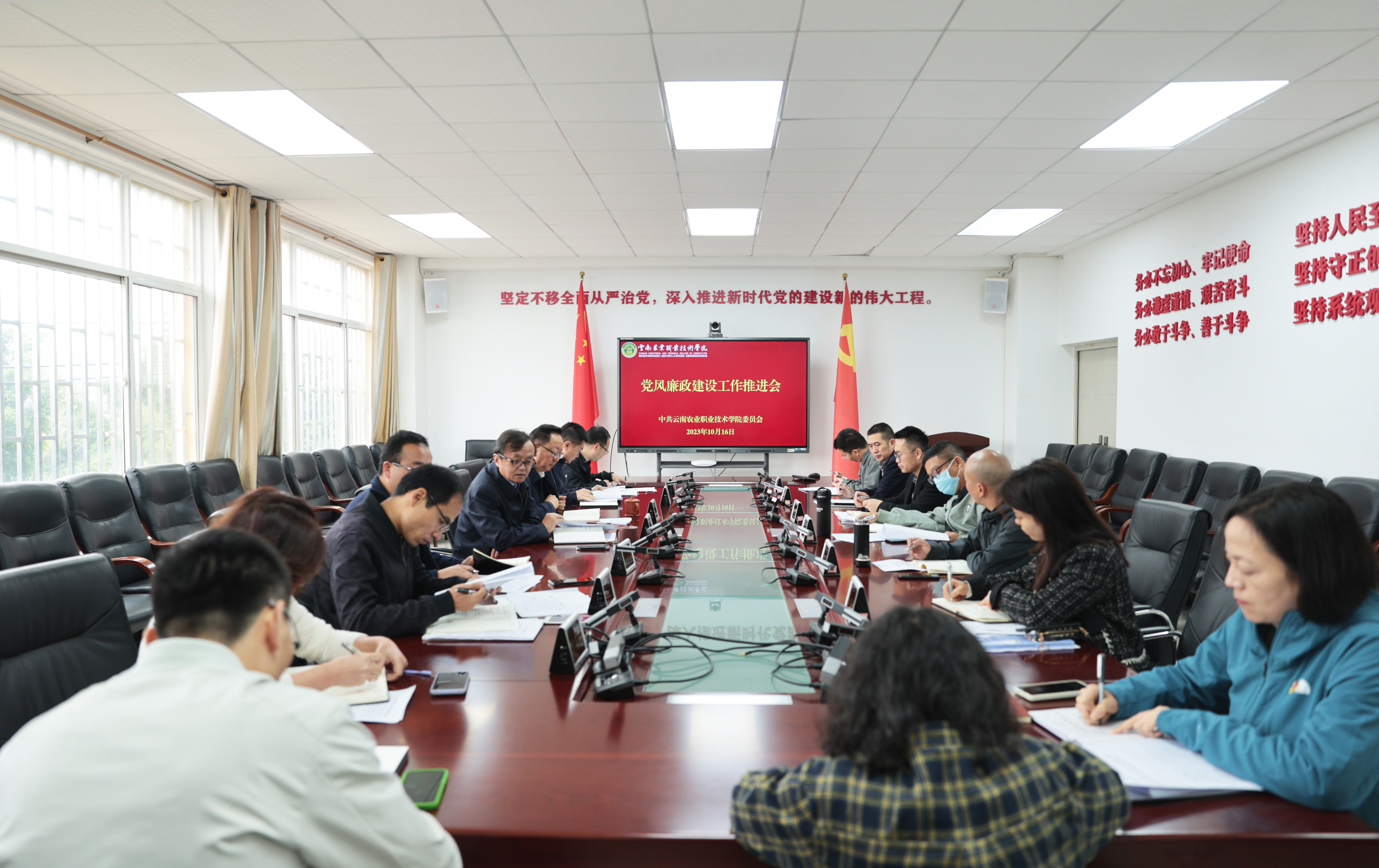 为贯彻落实党的二十大精神,深入推进党风廉政建设和“清廉农职”建设工作部署落实落细,10月16日上午,学院党委在小哨校区综合楼四楼会议室组织召开党风廉政建设工作推进会暨“清廉农职”建设监督检查工作部署会议,党委书记文俊、纪委书记冯志宏及11个相关职能部门负责人参加会议。