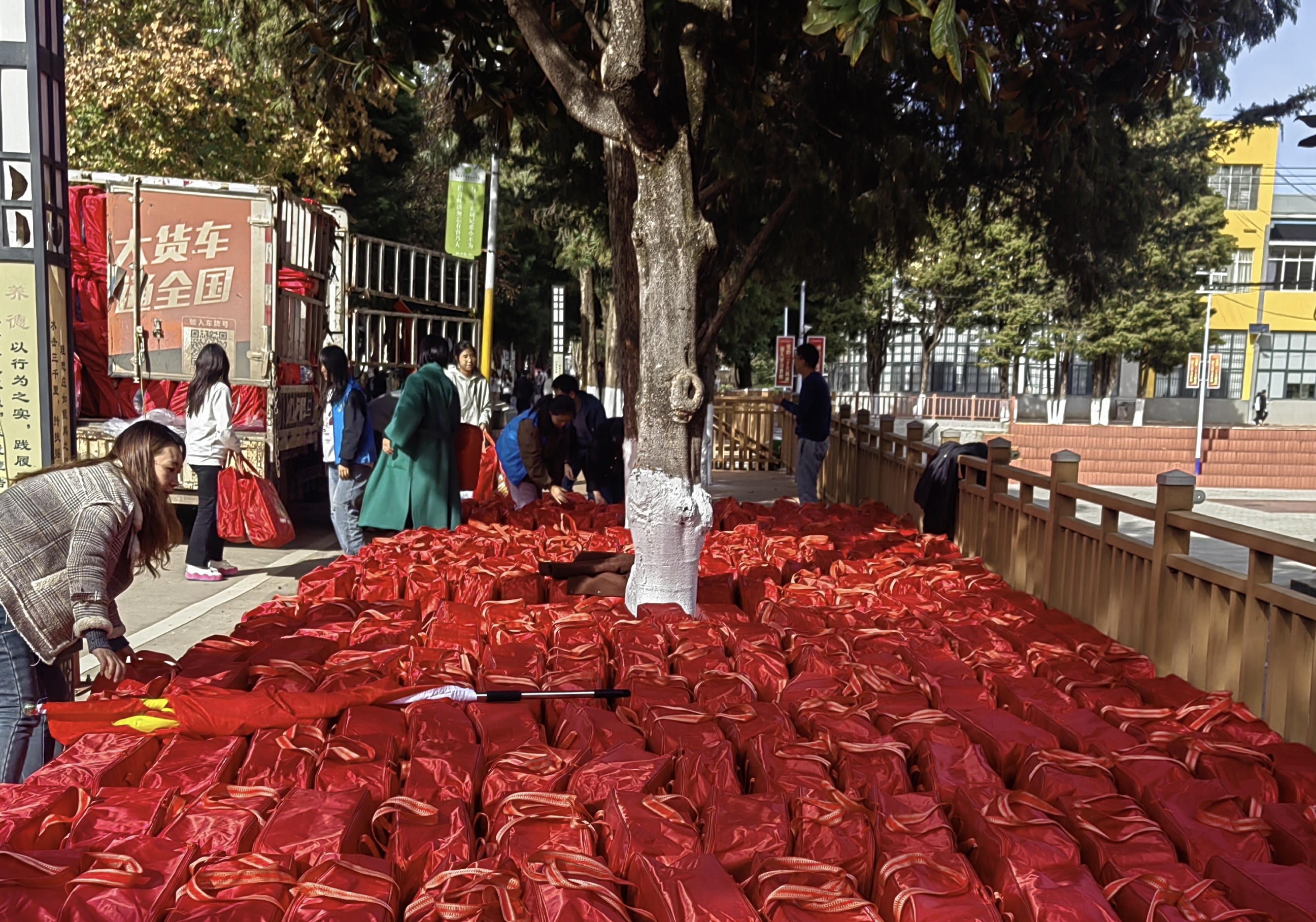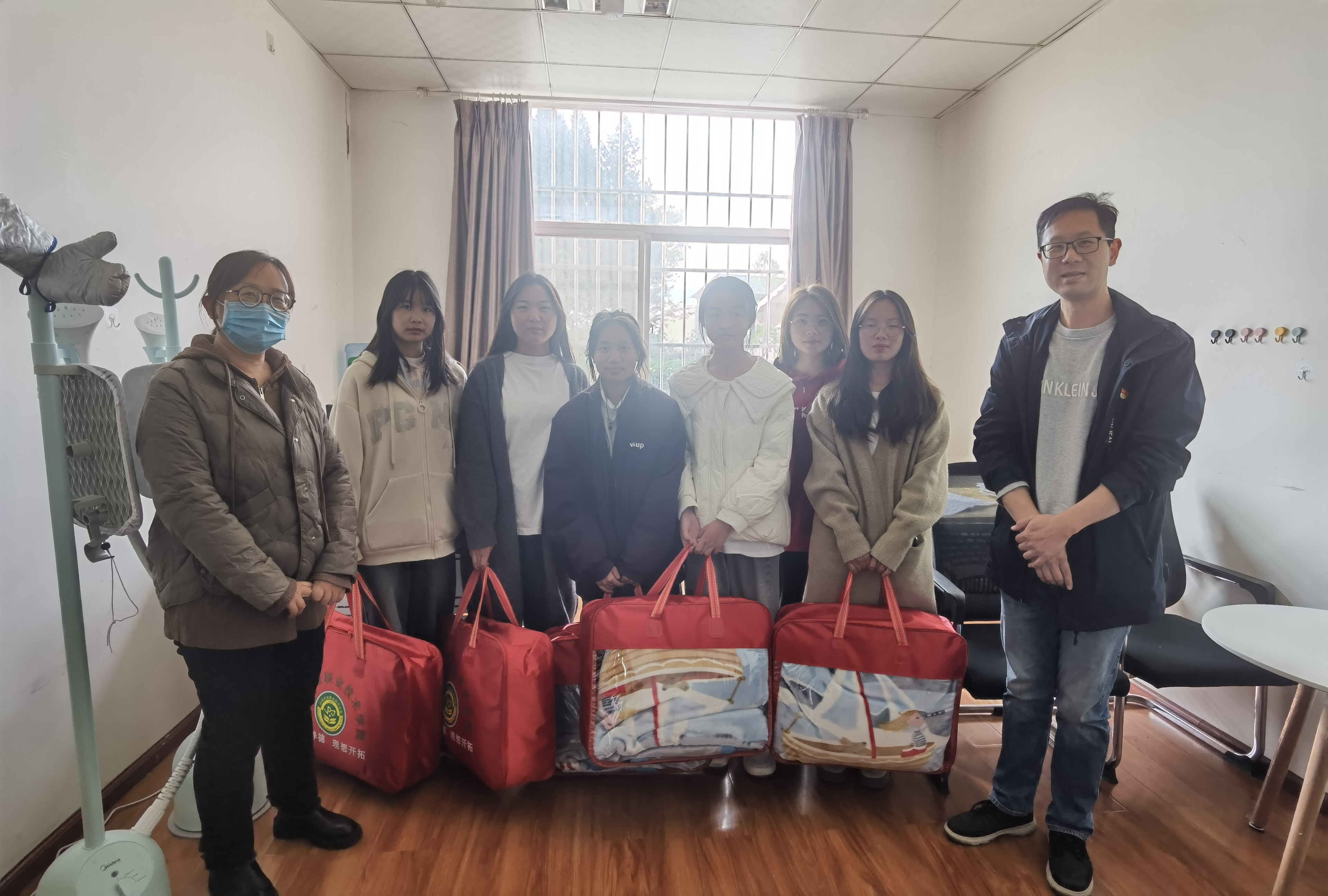 学生处分发毛毯现场