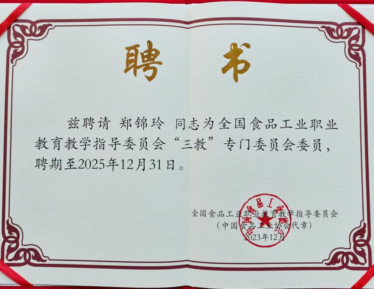 12月7日-8日,全国食品工业职业教育教学指导委员会全体会议在漯河召开,我院食品药品与大健康学院郑锦玲教授当选为全国食品工业职业教育教学指导委员会“三教”改革专门委员会委员。