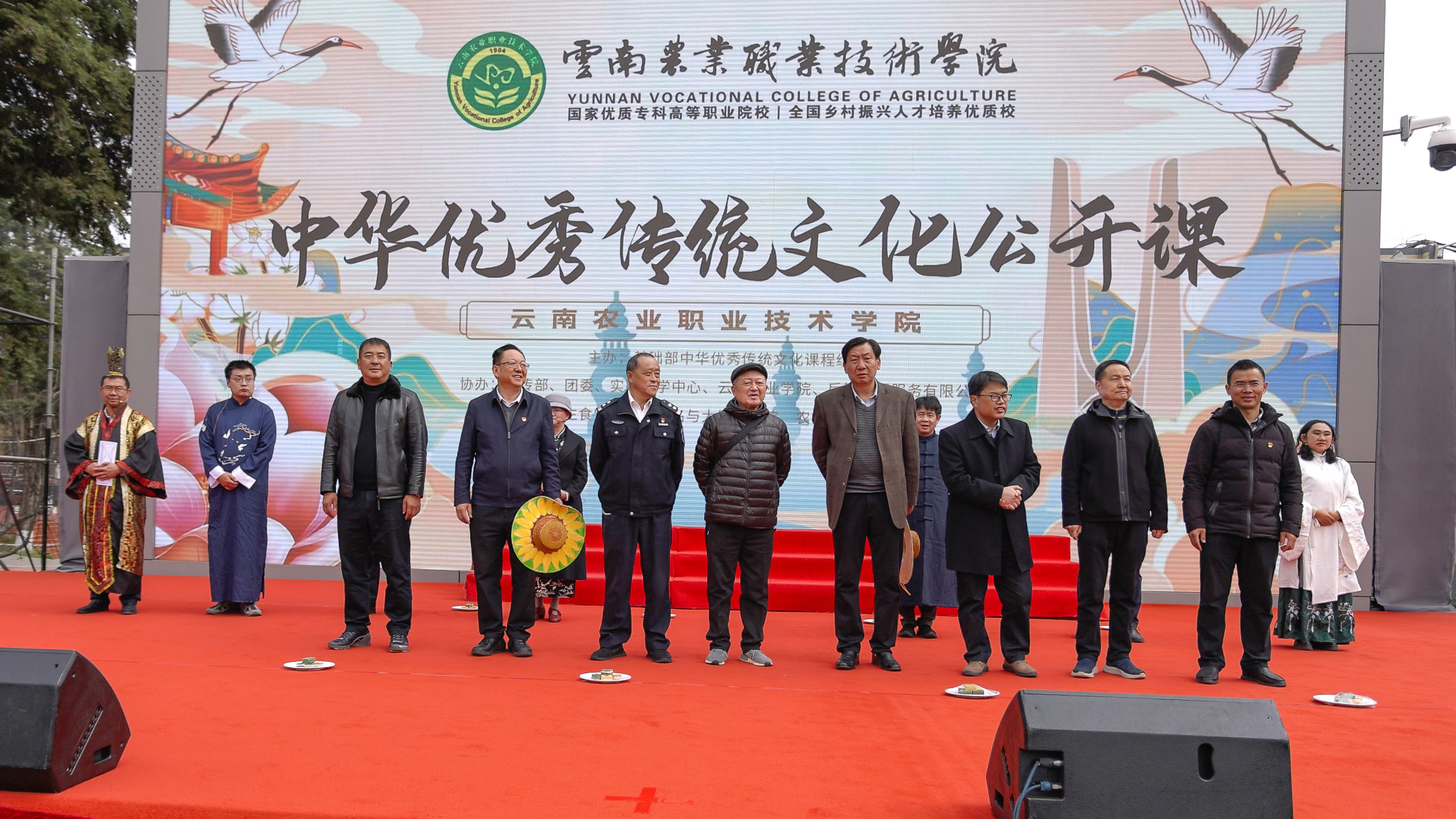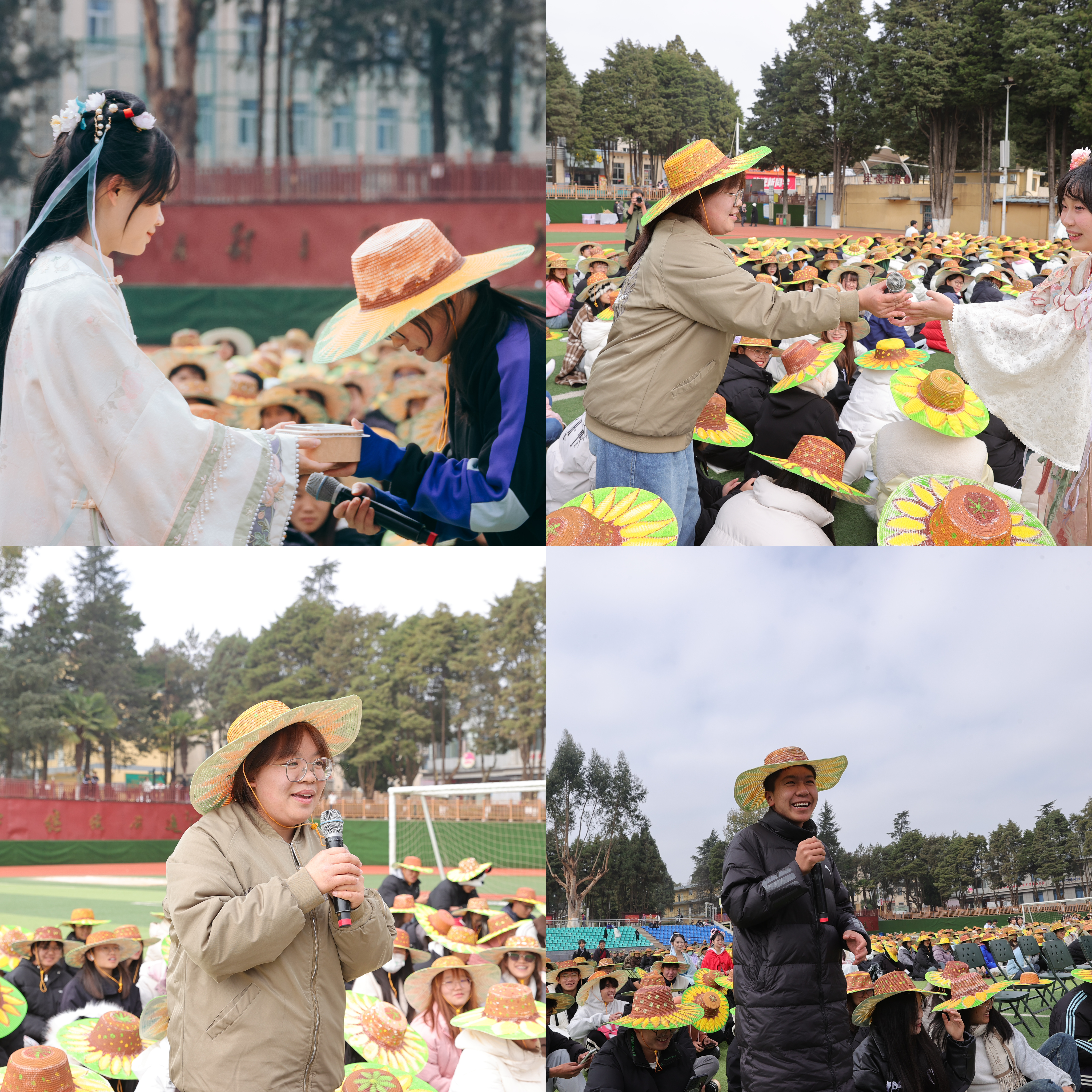 本堂公开课由我院中华优秀传统文化课程组的8位教师共同讲授,邀请云南省教育厅关工委常务副主任刘沧山、云南省教育厅关工委副秘书长王忠星;原云南省农业学校校长李铸声,杰出校友、学院88届毕业生李万彬;学院党委书记文俊、院长陈太安、党委副书记伍学龙、纪委书记冯志宏、副院长苏华伟到场参加,共计1800余名师生头戴农职专属手绘向日葵草帽共同聆听授课。公开课以知识竞答赛、文艺展演等形式将中华优秀传统文化与大学生思想政治教育相结合,让同学们在沉浸式体验中感悟中华民族博大精深的文化魅力,特别是在农耕文明中体现出来的勤劳质朴、崇礼亲仁,教育引导广大师生勇担强农兴农的时代使命。