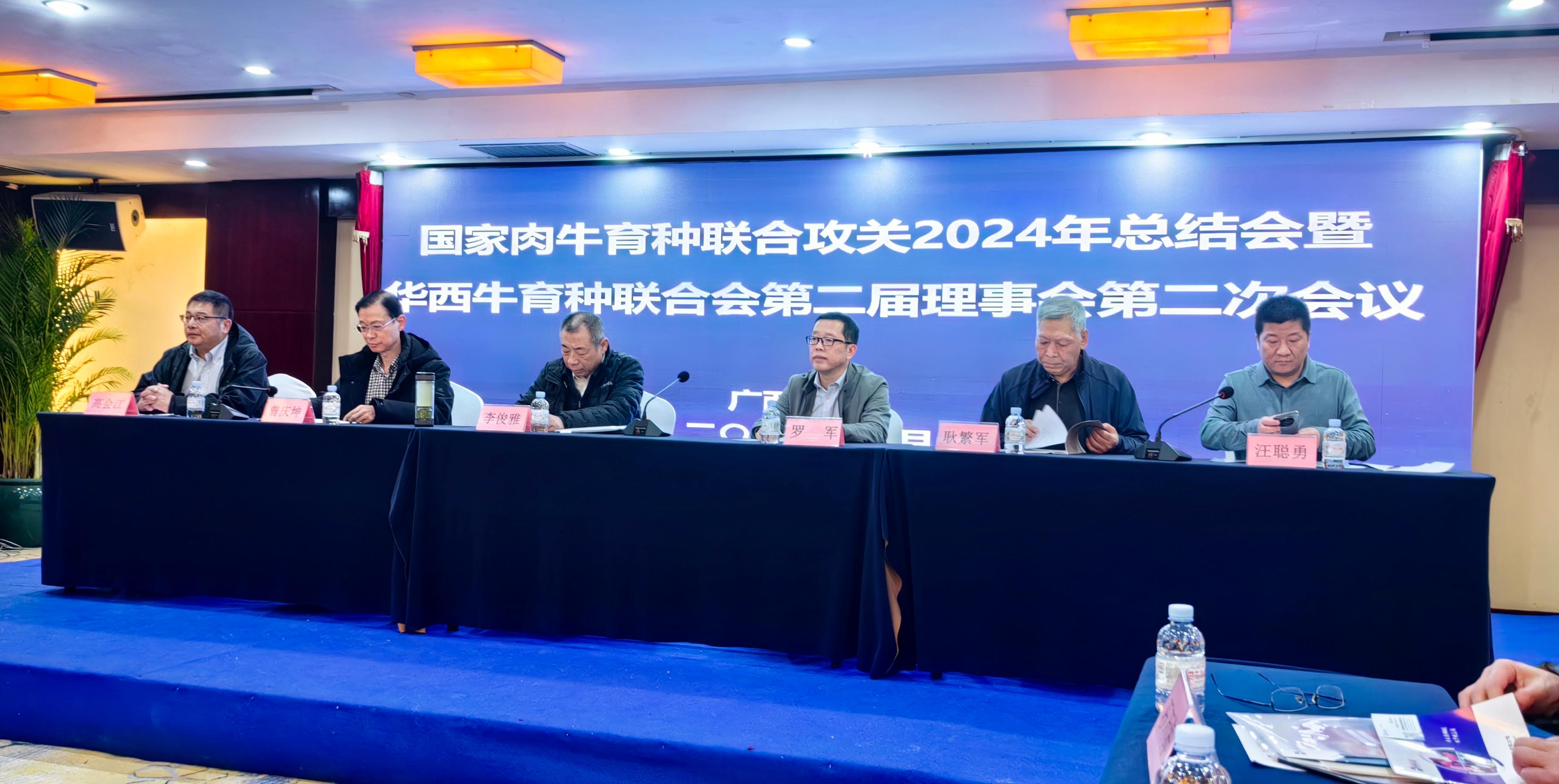 会上,广西壮族自治区农业农村厅领导、华西牛育种联合会理事长分别致辞;华西牛育种联合会专家组组长李俊雅研究员作讲话;华西牛育种联合会专家组成员高会江研究员详细介绍了国家肉牛育种联合攻关及华西牛育种联合会2024年工作开展情况及2025年工作计划;参会的11家理事单位分别汇报了2024年攻关情况,并就下一步工作重点和存在的问题等进行研讨,我校种牛场场长刘绍贵作为专家对汇报进行点评;首席专家李俊雅研究员部署2025年联合攻关工作等。