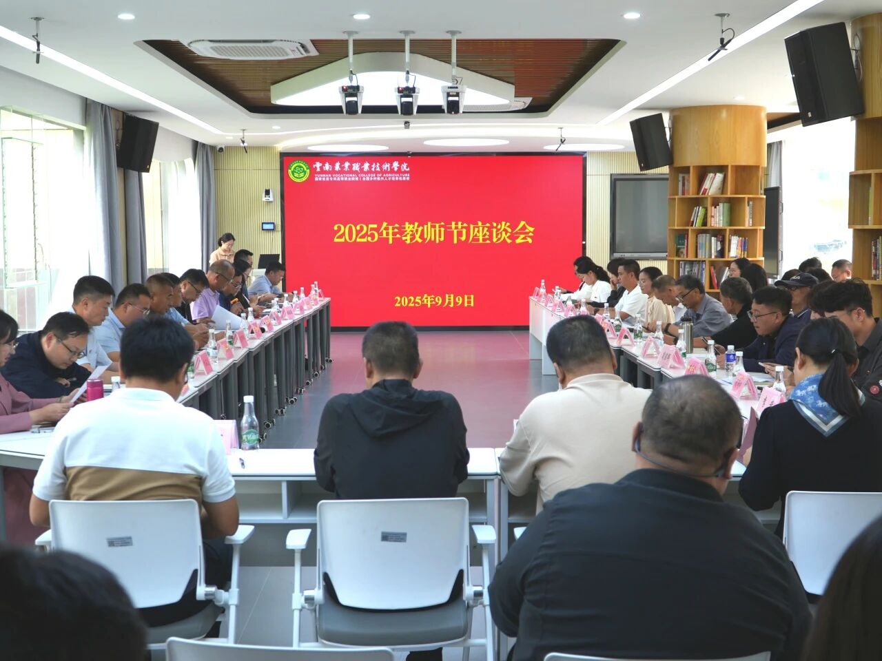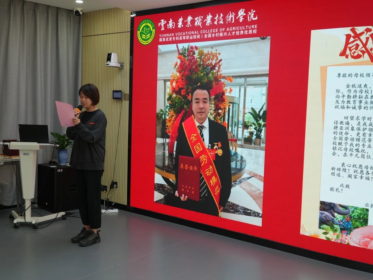 躬耕育桃李,匠心润初心。在第41个教师节来临之际,学校在教师培训中心召开教师节座谈会。会上,与会人员共同观看了学生代表祝福视频,我校畜牧兽医学院(宠物科技学院)毕业生、2025年全国劳动模范保明伟以贺信形式向老师们表达节日祝福,同学们真挚的话语和热情的祝福,让在场的老师们倍感温暖。
