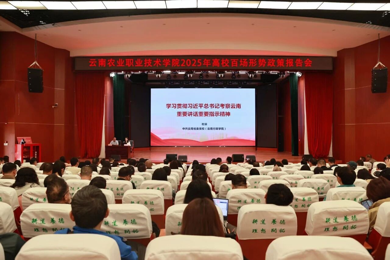 9月18日,我校在小哨校区蚕桑礼堂召开2025年高校百场形势政策报告会暨学习习近平总书记考察云南重要讲话重要指示精神专题辅导报告会。本次报告会特别邀请中共云南省委党校(云南行政学院)科学社会主义教研部主任杜琼教授担任主讲人,为师生深入解读重要讲话精神的核心要义与实践要求。报告会由学校组织部部长夏体韬主持。