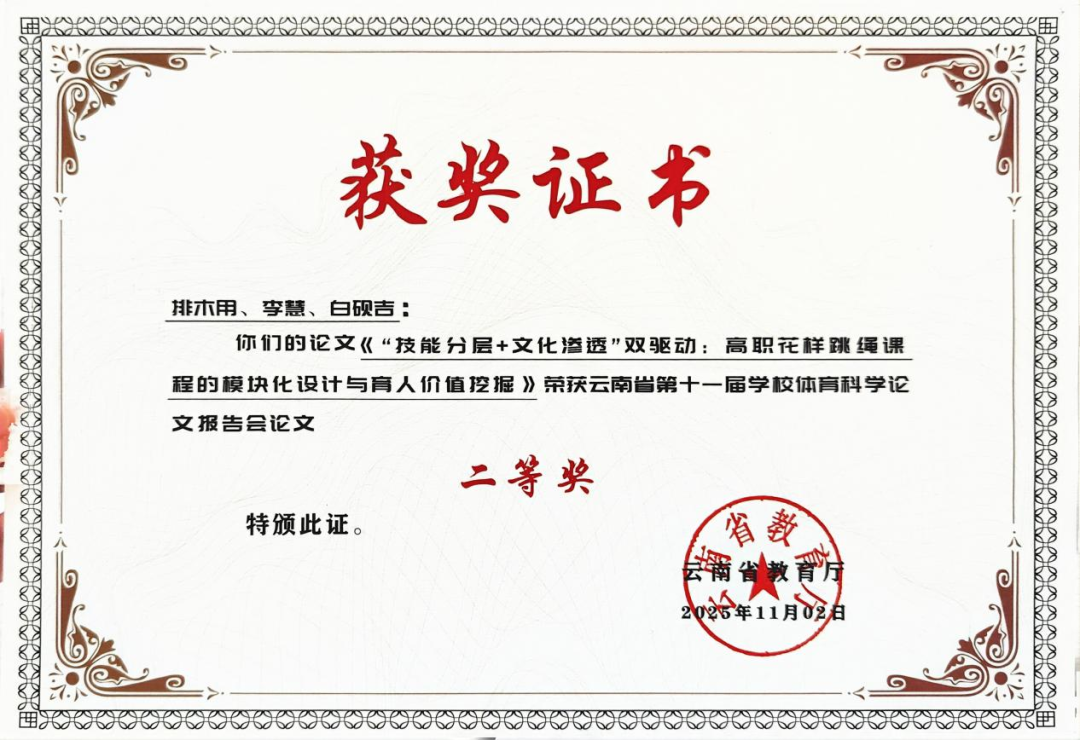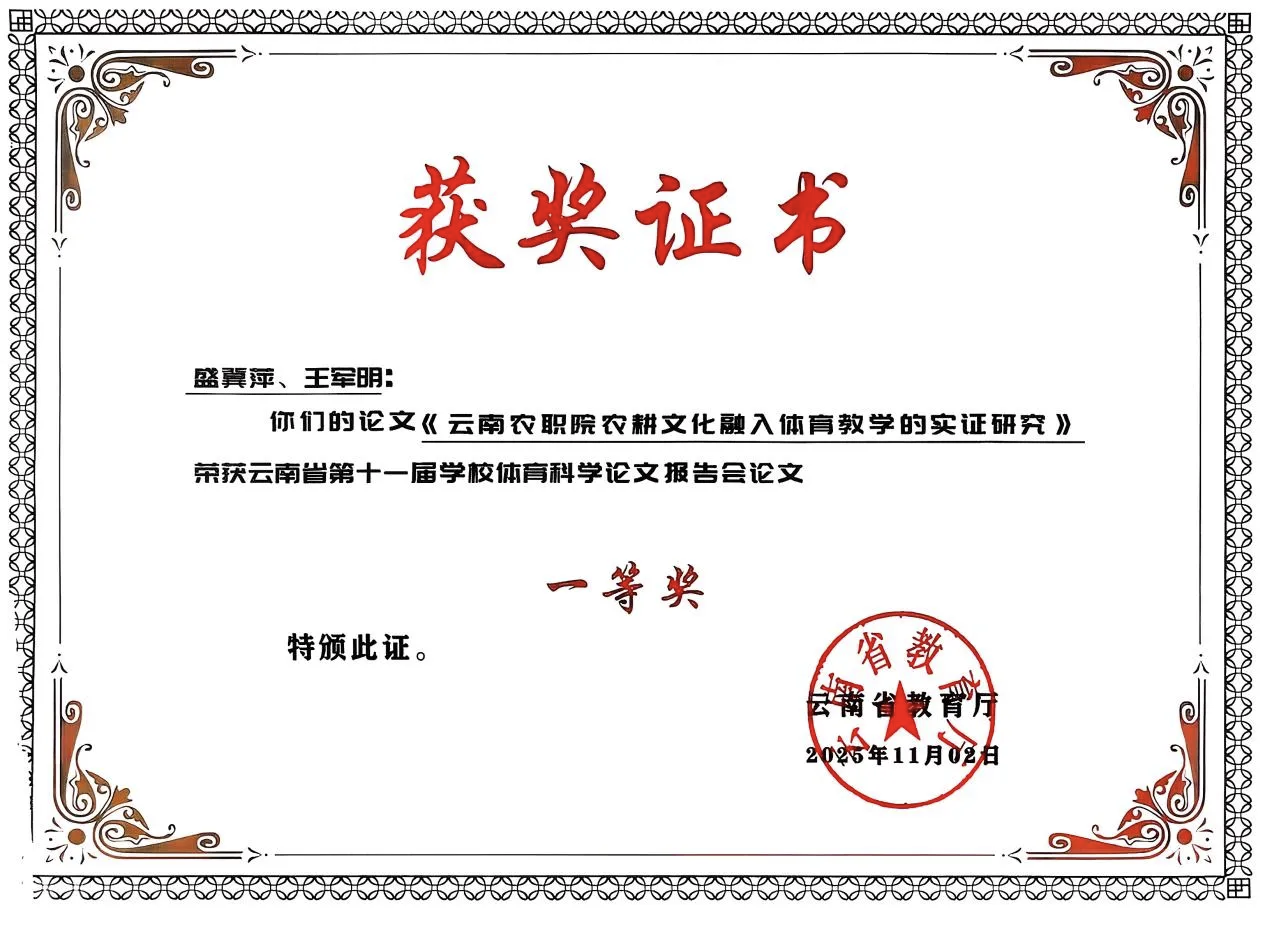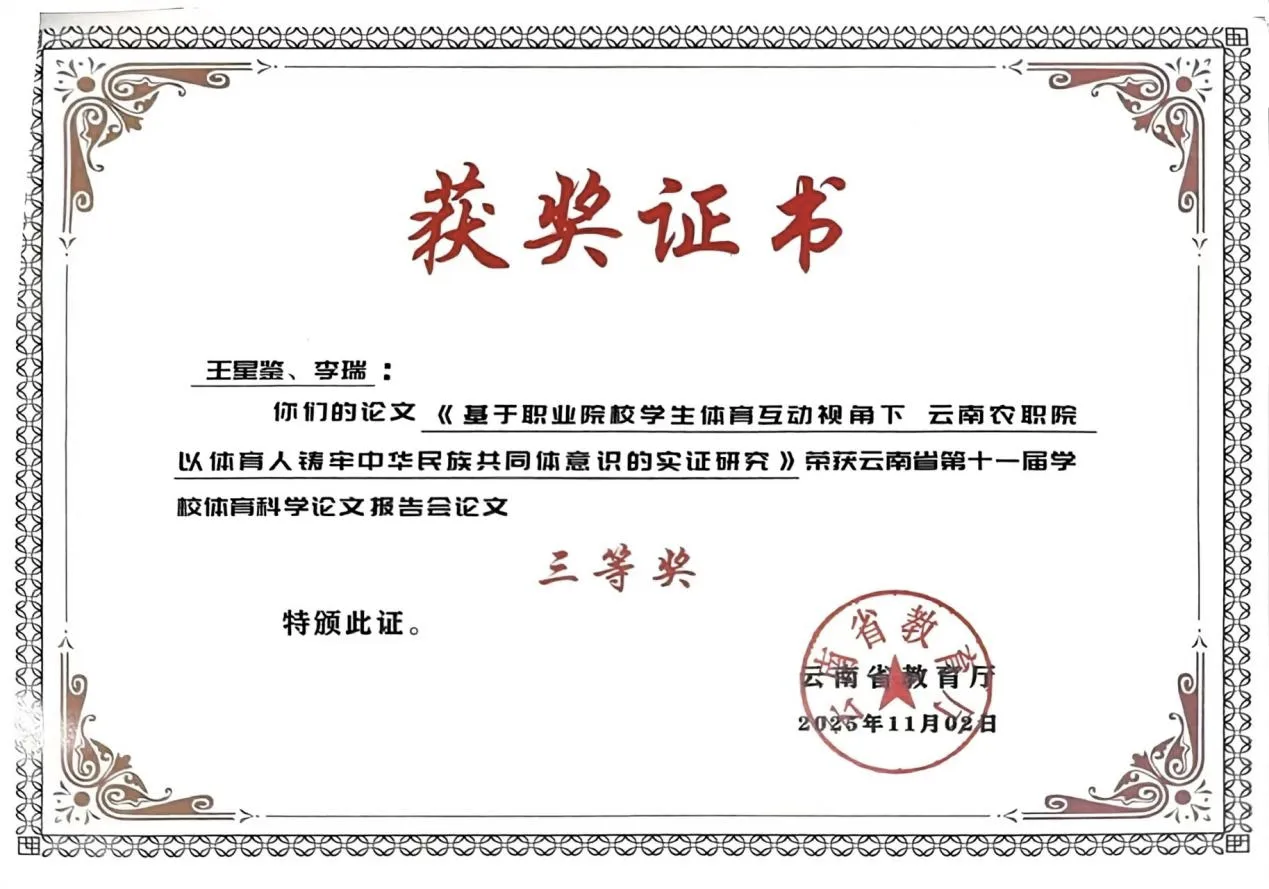 此次获奖不仅是对学校教师科研能力与教育实践成果的高度肯定,也为学校进一步深化改革、提升育人质量注入了新的动力。下一步,学校将继续坚持“以体强心、以美润心”的教育理念,推动体育与美育工作协同发展,为培养德智体美劳全面发展的高素质技术技能人才作出更大贡献。(通识教育学院 供稿/图、文:侯曼/一审:侯曼、二审:唐丽群、三审:杨筱莹/一校:侯曼、二校:张敏、三校:唐丽群/责任编辑:唐丽群)
