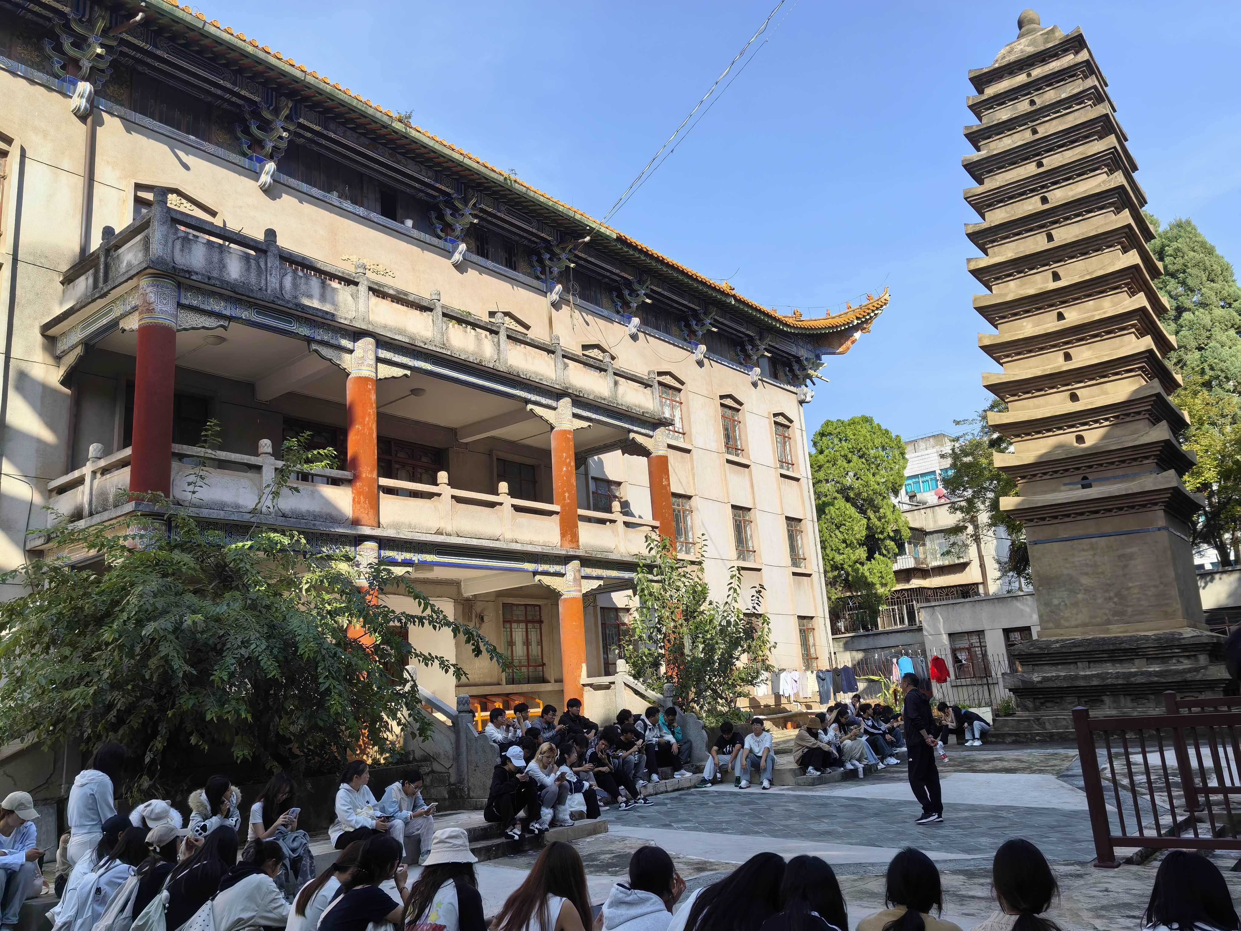 研学终点,师生们抵达大德寺双塔,回溯1930年,我校在大德寺内省立高中农科班的基础上恢复办学,之后更名为昆华农业学校,办学期间中共云南省委第一任书记王德三烈士在我校以教师身份为掩蔽开展革命工作,成为我校世代流传学习的光辉榜样。师生齐唱校歌,“耕道、养德、理想、开拓”的校训在双塔间回响。冯志宏教授寄语同学:“从大德寺到花庄河,再到小哨、茭菱,一代代云农职人把课堂立在田野、把论文写在大地,希望你们把今天的感动变成明天的行动。”