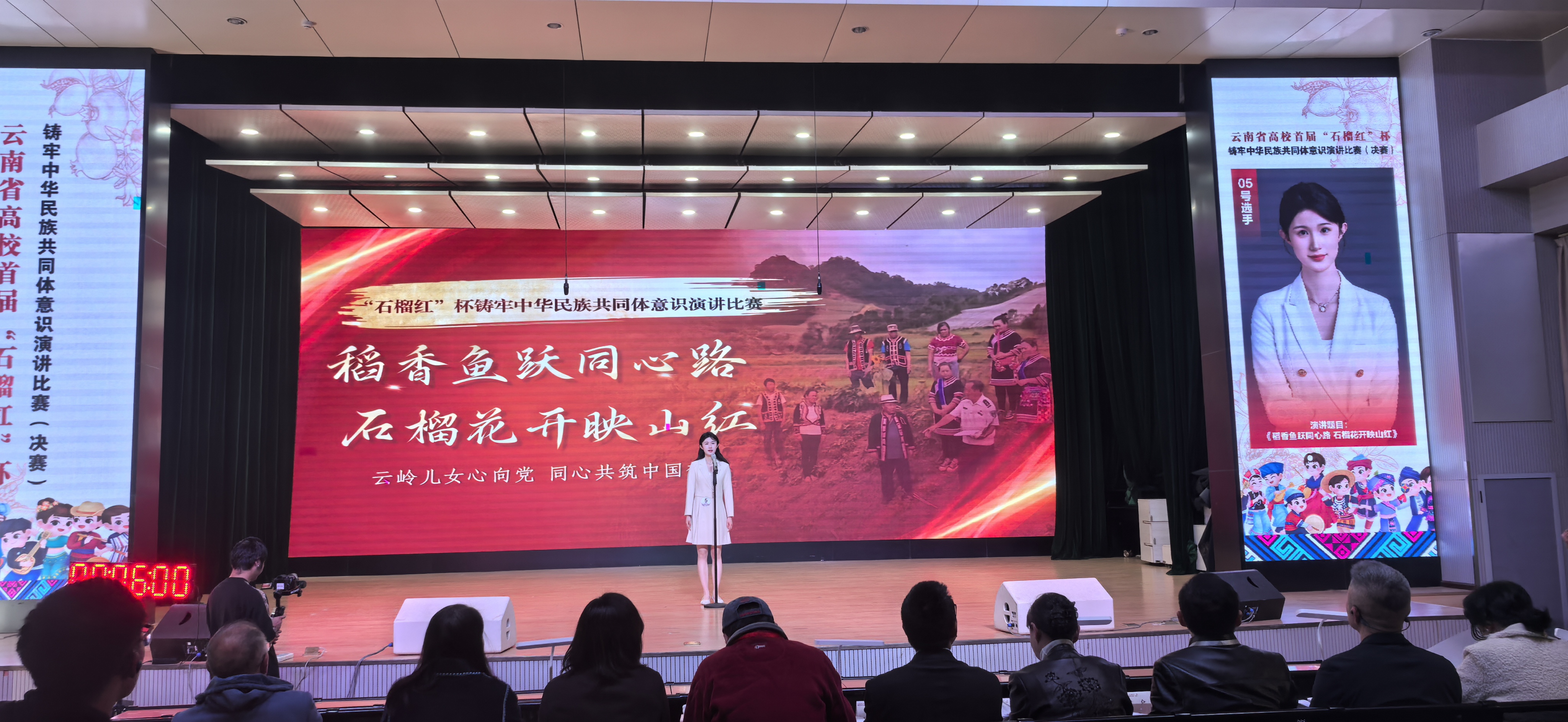 我校高度重视此次比赛,积极组织校内选拔,遴选优秀选手,组建指导团队开展系统培训,有关部门、各二级学院、校团委积极推荐师生参与。最终刘琦琳、黄欣然两位老师成功晋级全省决赛。比赛现场,黄欣然以《稻香鱼跃同心路,石榴花开映山红》为题,深情讲述了我校毕业生、全国“人民满意的公务员”李万彬为了澜沧江的水清鱼跃 ,扎根拉祜山乡30余年,手把手向乡亲传授生产技能、助力乡村振兴的民族团结故事,质朴的叙事中饱含温情与力量;刘琦琳则以《赤心守寸土,同心护中华》为题,生动刻画了云南文山熊光泽一家三代守边人坚守边疆、守护家园的赤诚形象,展现了各民族共护国土、同心筑梦的深厚情怀。两位教师的演讲情感真挚、事例鲜活、感染力强,赢得评委与现场观众的一致认可。