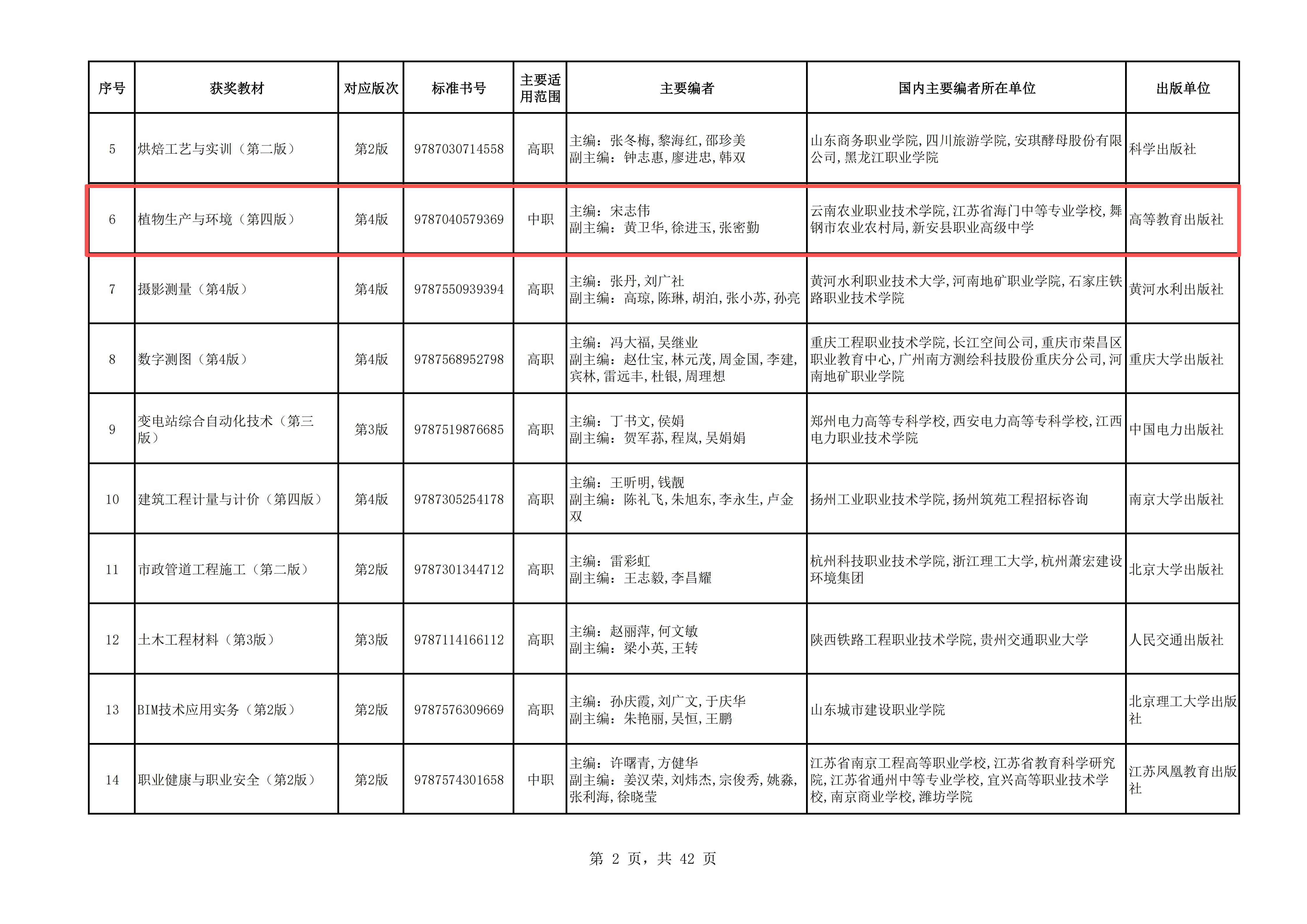 据中华人民共和国教育部官网公布的《关于第二届全国教材建设奖评选拟奖励名单的公示》《关于第二批“十四五”职业教育国家规划教材遴选结果的公示》名单,我校宋志伟教授主编的《植物生产与环境(第四版)》(高等教育出版社)教材获第二届全国教材建设奖一等奖,实现学校在该奖项上零的突破。