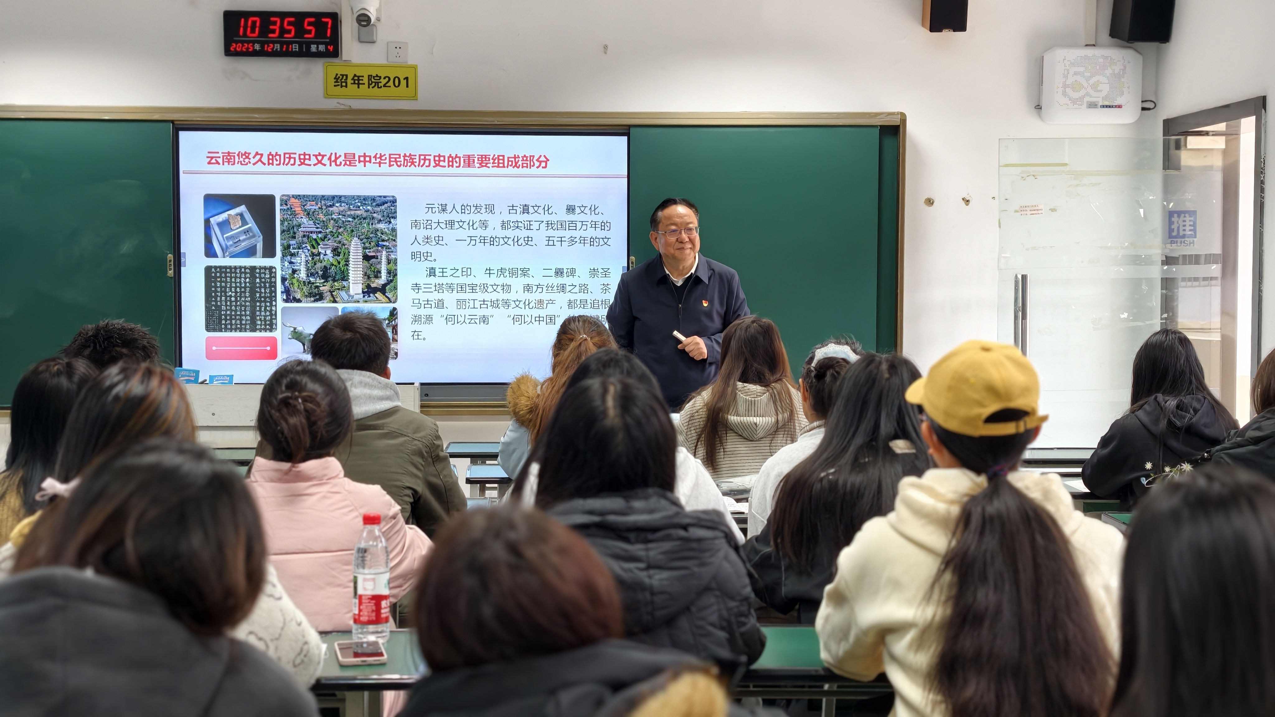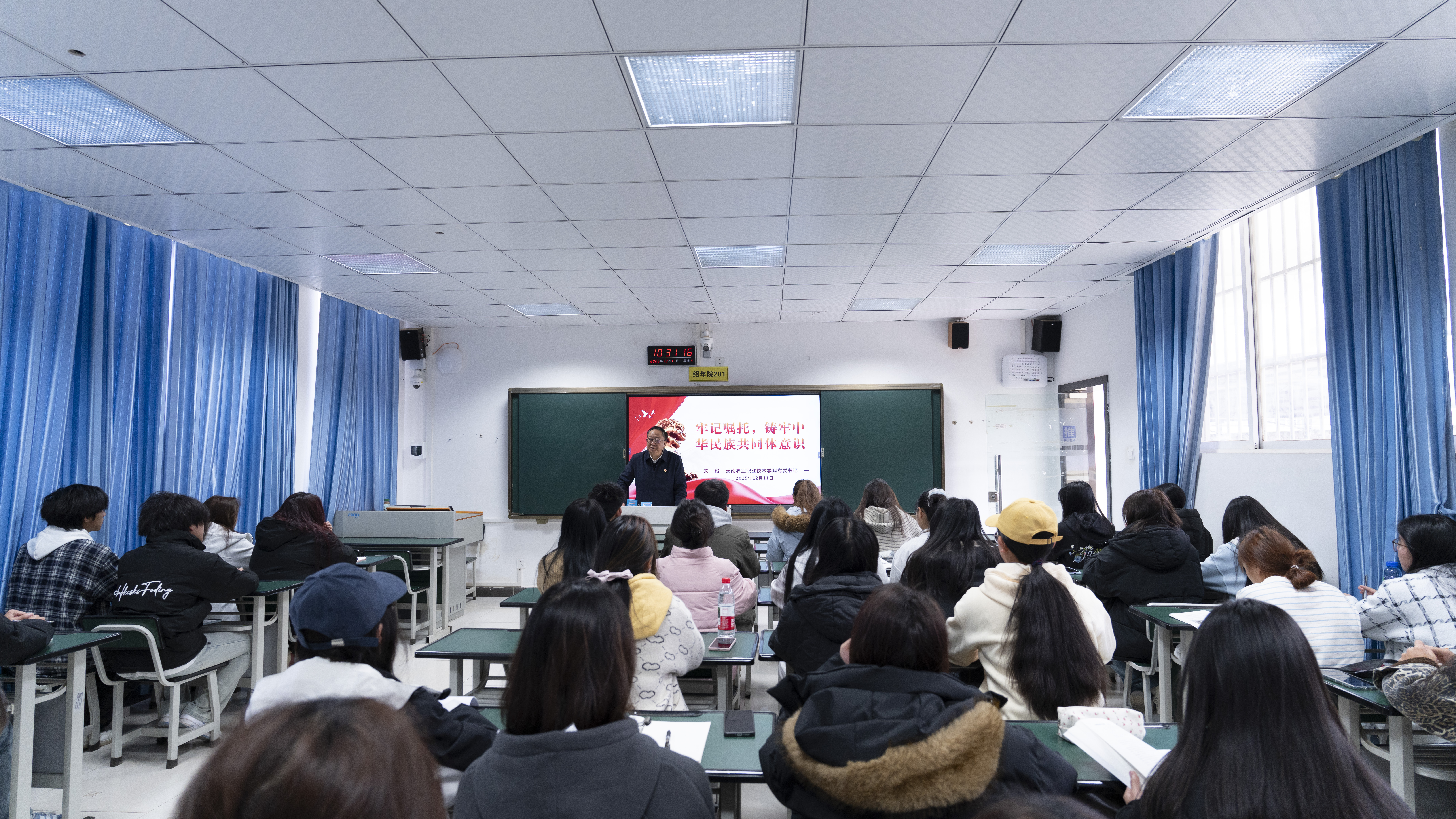 12月11日,学校党委书记文俊走进25花卉生产与花艺一班课堂,以《牢记嘱托,铸牢中华民族共同体意识》为题,将政策理论与地域文化、专业实践深度交融,为同学们带来一堂兼具思想厚度与情感温度的思政课。课堂围绕“历史的回响”“科学内涵的精准把握”“民族团结进步示范区建设”“青年学子的责任行动”四个维度层层展开。