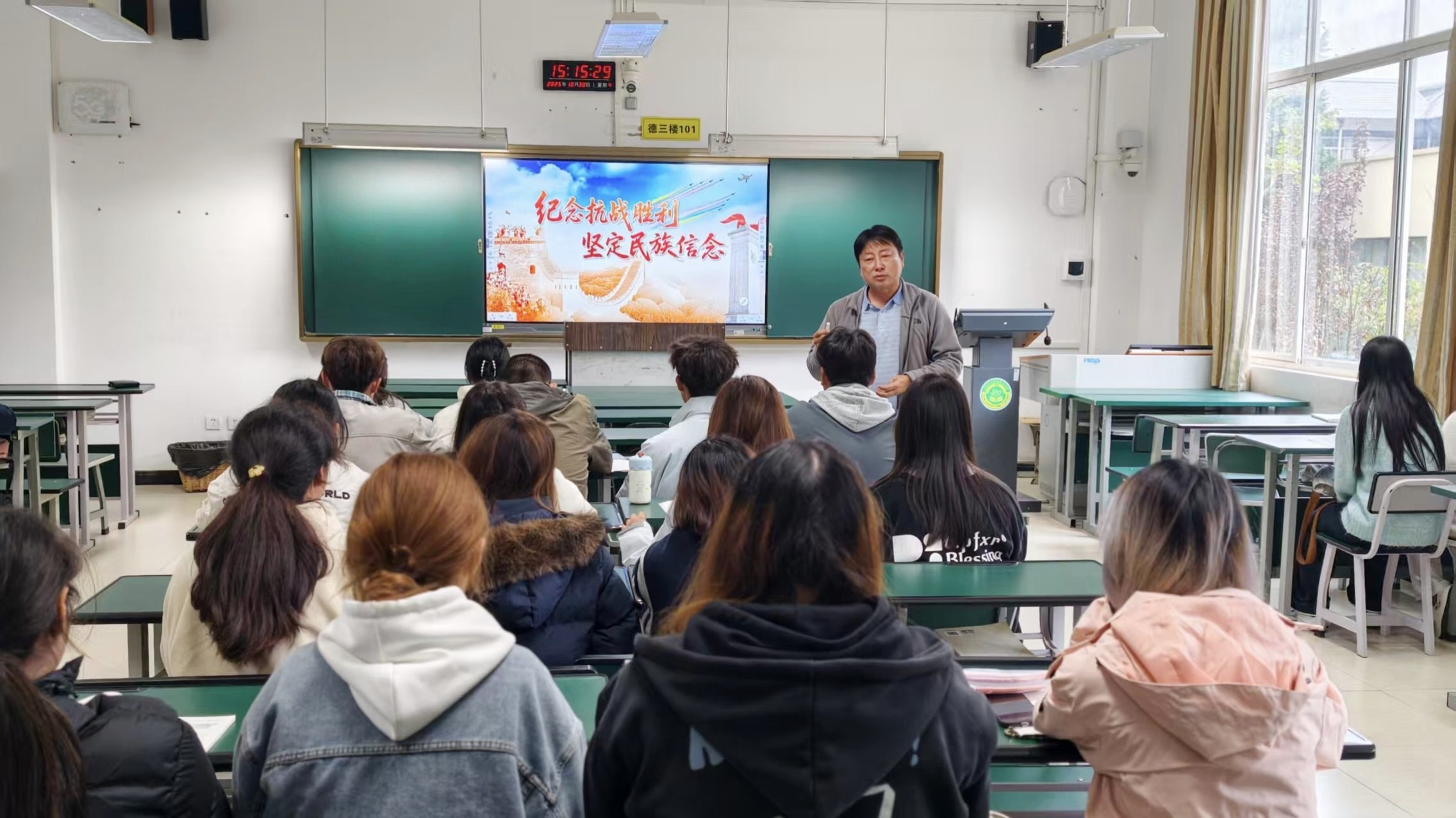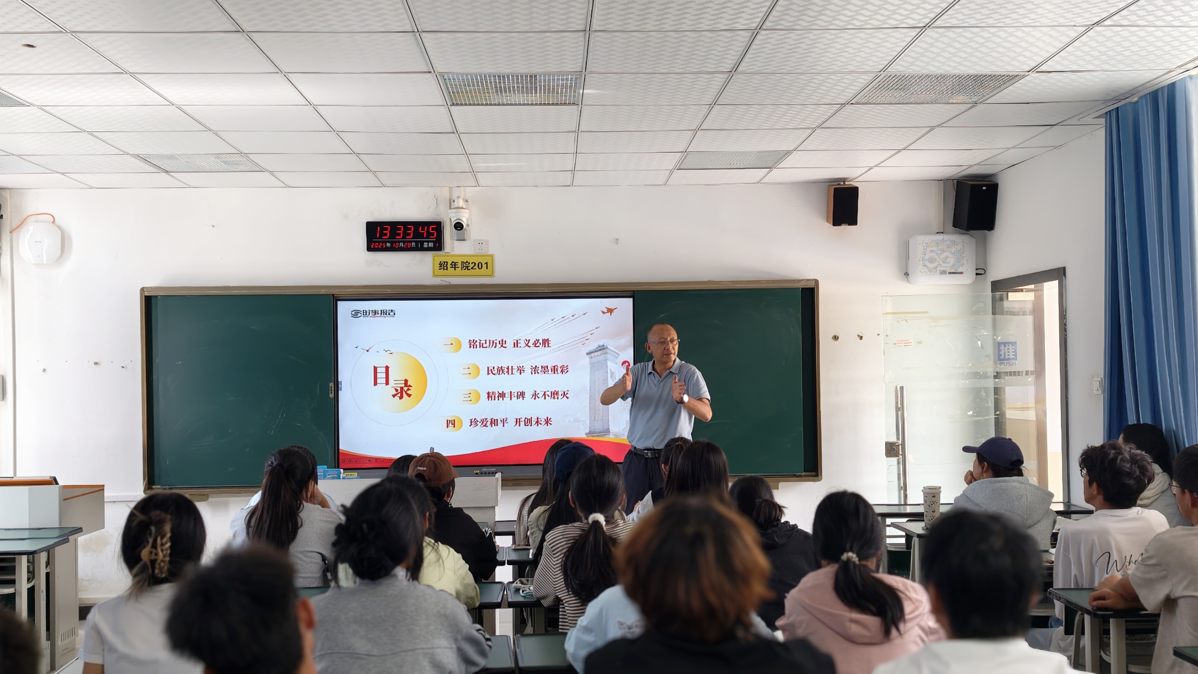 党委副书记孙继先,纪委书记、监察专员柳勇以《纪念抗战胜利 坚定民族信念》为主题,分别为25现代农业技术二班、24工程测量技术二班同学授课,带领学生重温抗战历史,进一步坚定民族自信与爱国信念;副校长杨涛、姚廷超、苏华伟则共同围绕《阔步迈向农业强国》主题,分别为24畜牧兽医四班、22 畜牧兽医七班(五年制)、24食品检验检测技术一班同学解读农业强国建设的战略意义与发展路径,明确青年学子在农业领域的责任与担当;副校长盛冀萍以《决胜 “十四五” 奋进向前行》为题,为25畜牧兽医五班学子深入分析“十四五” 时期的发展机遇与挑战,引导学生将个人发展与国家战略紧密结合。