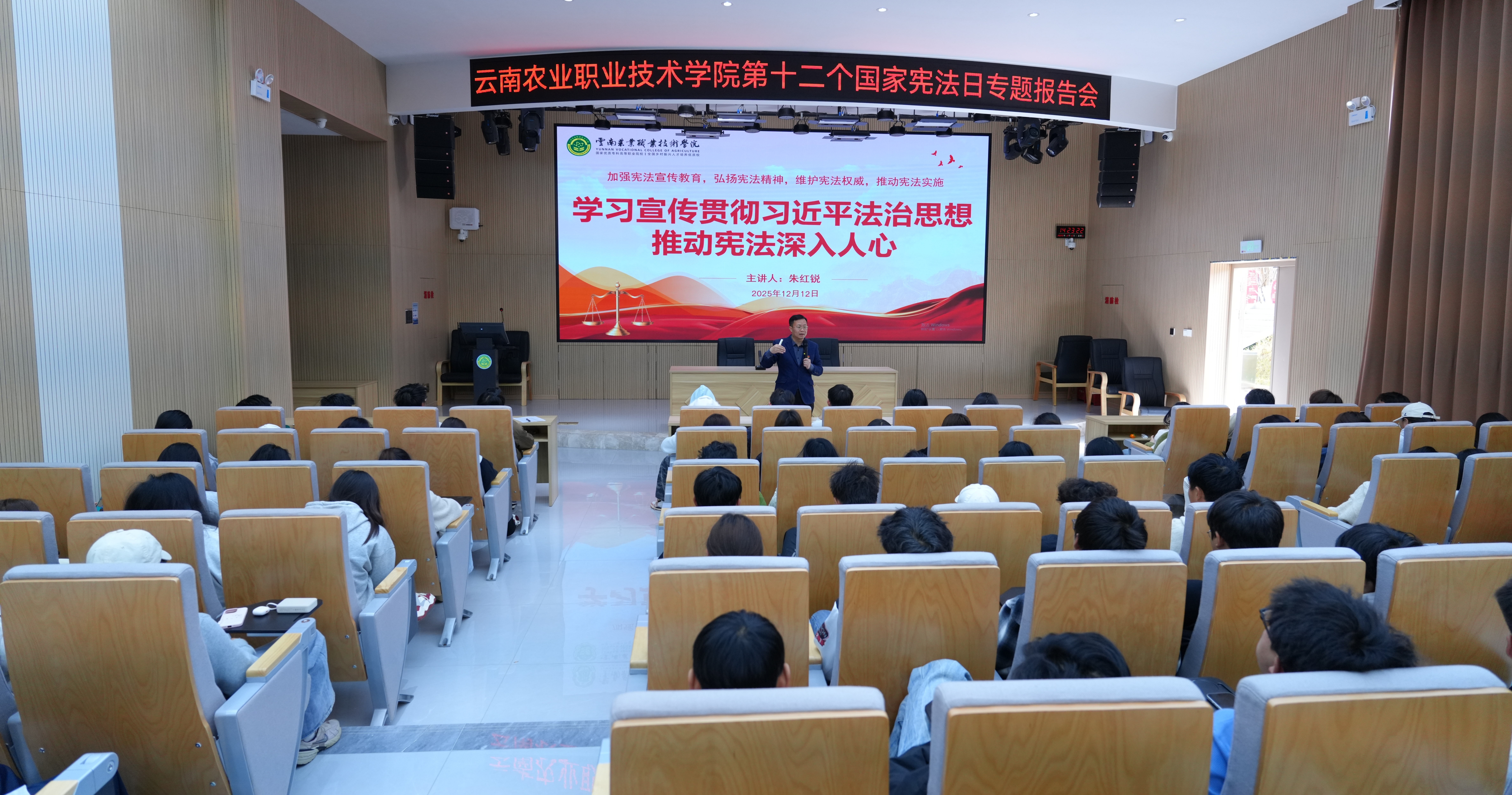 12月12日,学校在小哨校区综合楼阶梯教室举办第十二个国家宪法日专题报告会。特邀我校马克思主义学院党总支书记朱红锐担任主讲人,为同学们带来一堂深刻的宪法知识普及与法治理念培育课。