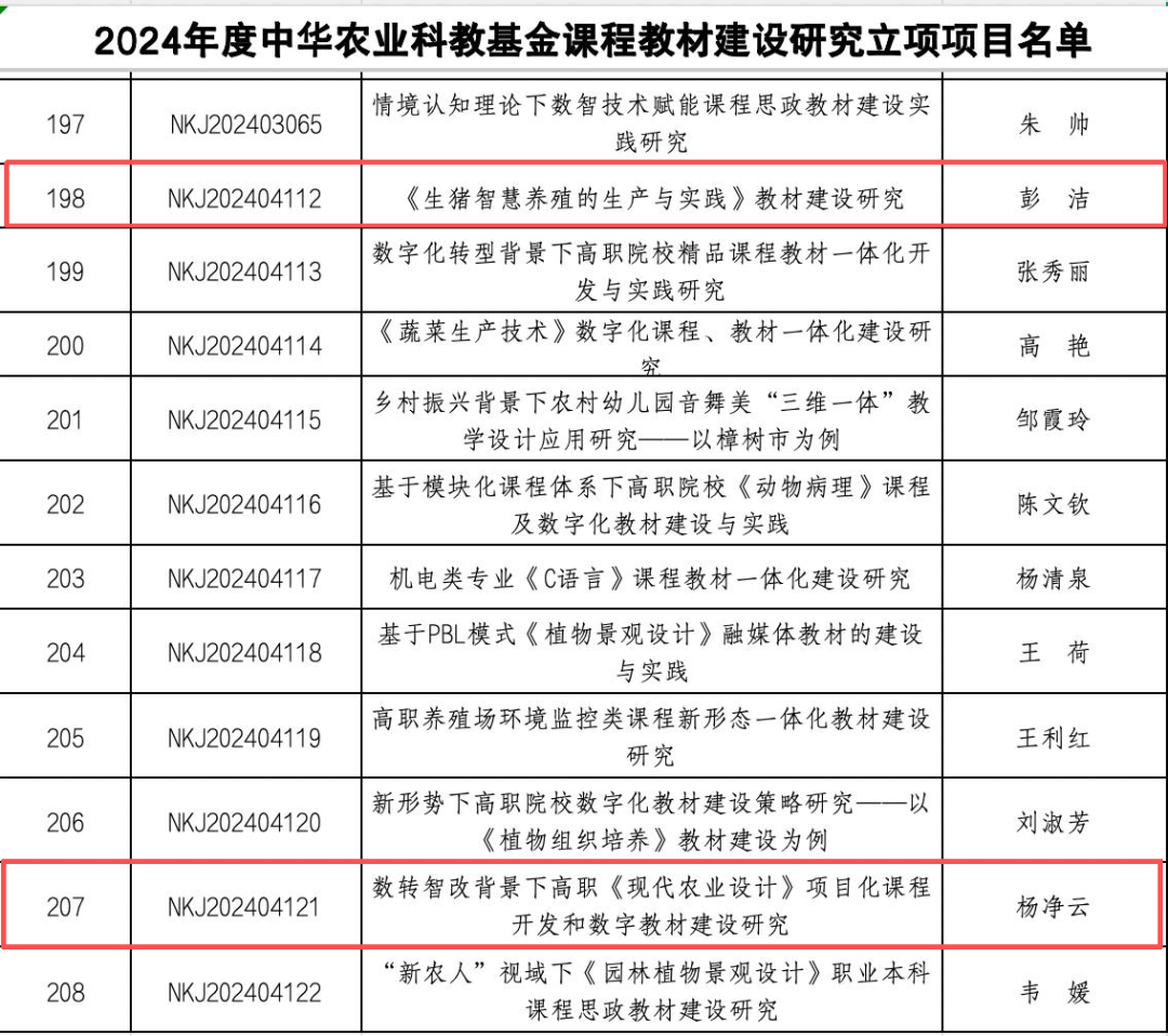 近日,2024年度中华农业科教基金课程教材建设研究立项项目名单正式公布。根据《中华农业科教基金课程教材建设研究项目管理办法》和《中华农业科教基金课程教材建设研究项目评审办法》相关规定,经组织申报、形式审查、专家评审、网站公示等多个环节,我校彭洁老师团队聚焦生猪智慧养殖领域的产业发展需求与职业教育人才培养痛点,杨净云老师团队紧扣数智转型趋势与现代农业设计专业教学改革方向,两支团队均秉持严谨务实的态度,反复打磨研究方案,精心撰写申报材料,完善佐证支撑,确保项目兼具科学性、实用性与创新性,最终在激烈竞争中成功突围。