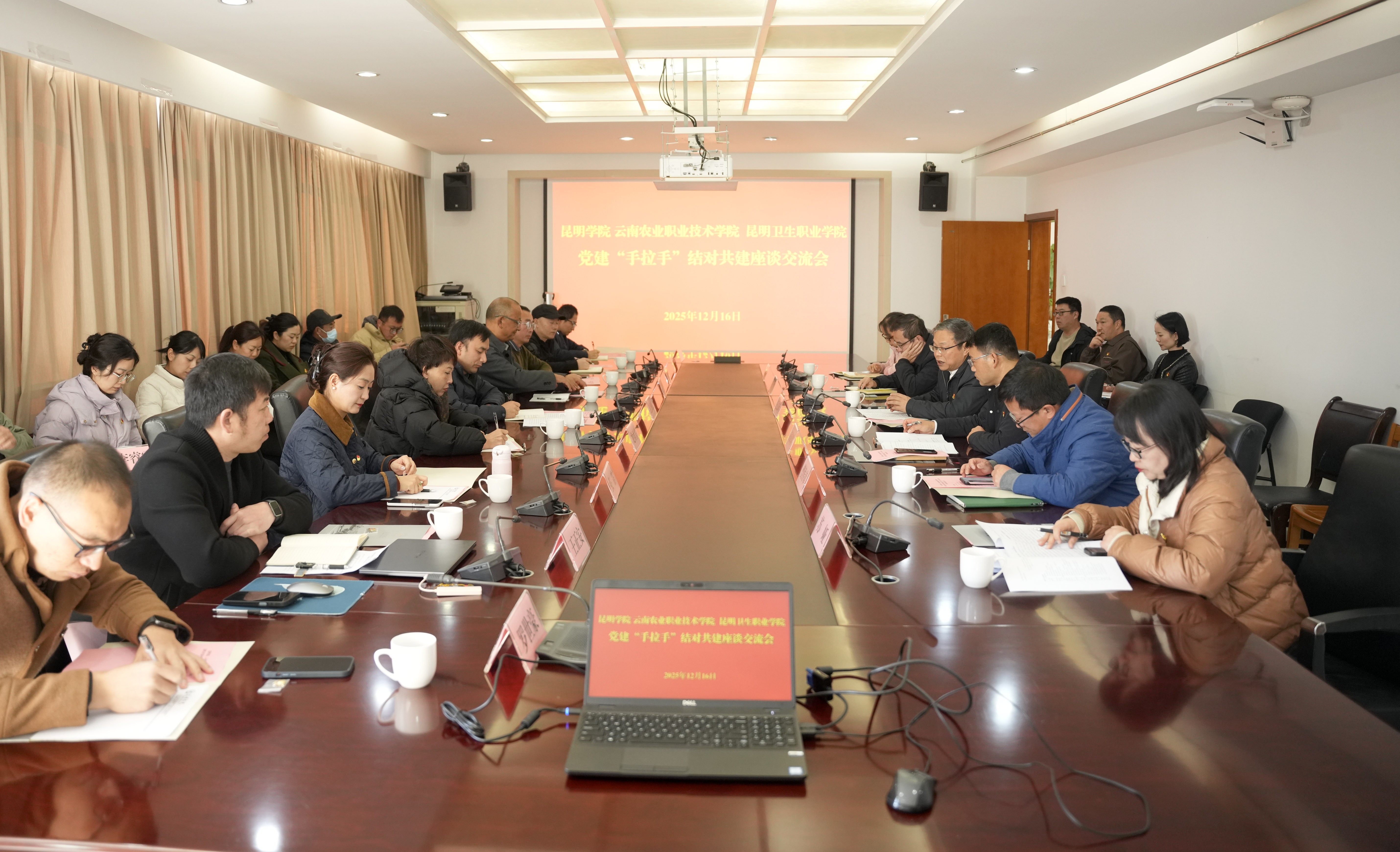 为深入贯彻落实新时代党的建设总要求,加强校际党建交流与合作,共同探索高质量党建引领高质量发展的有效路径,12月16日上午,我校与昆明学院、昆明卫生职业学院在昆明学院洋浦校区共同开展党建“手拉手”结对共建活动。昆明学院党委副书记王文成,昆明卫生职业学院党委书记(督导专员)马季昕,党委副书记、院长龙雨霏和我校党委副书记孙继先出席活动并讲话,三校组织部、相关二级党组织负责人、教师党支部书记及党员代表参加了本次活动。