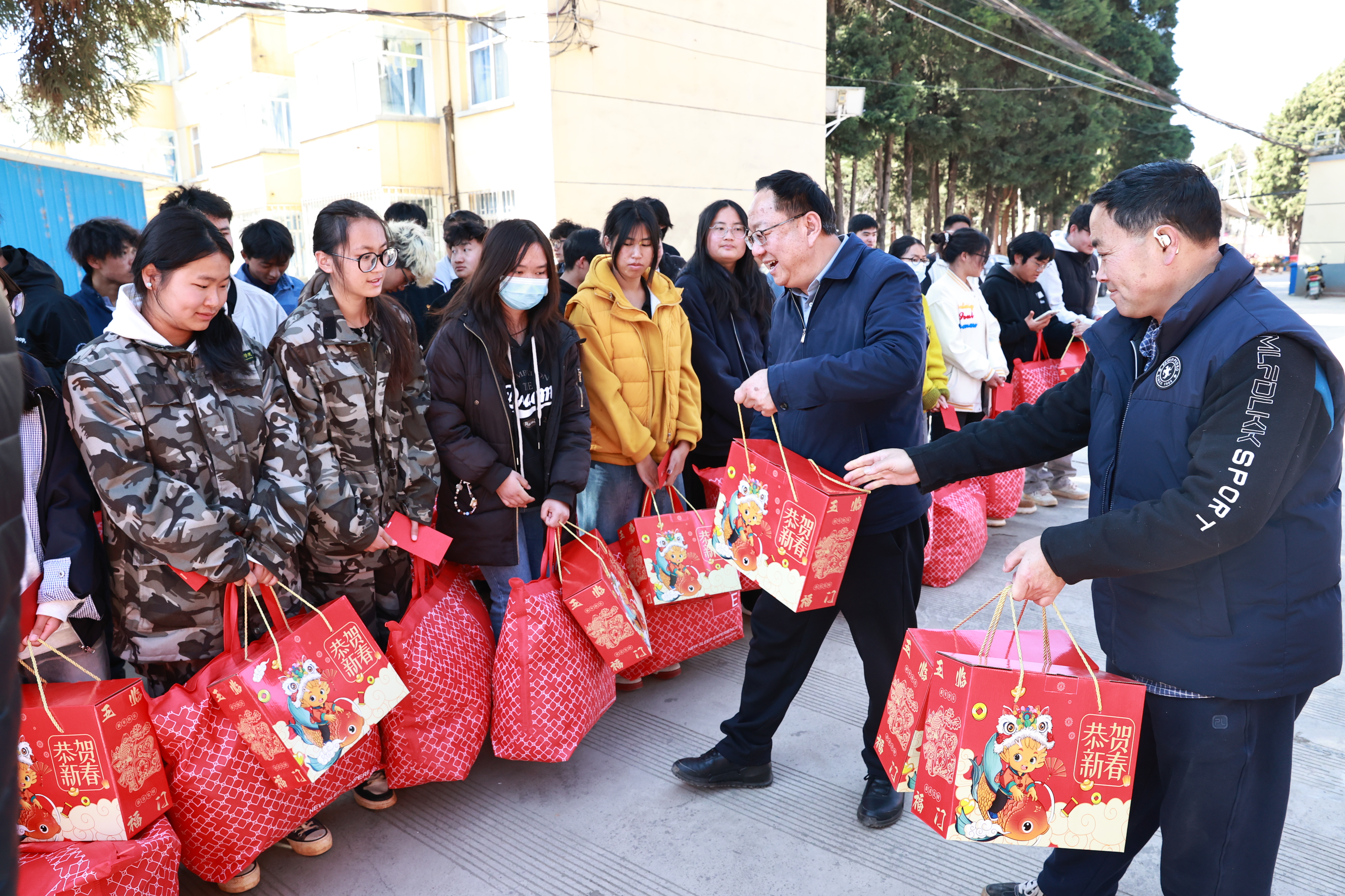 1月21日,学校党委书记文俊、党委副书记孙继先、副校长姚廷超与学校办公室、宣传部、学生处、保卫处、实践教学中心等相关职能部门负责人、留校学生所属二级学院负责人一行前往小哨校区,为留校学子送上新春祝福与慰问物资,暖心关怀让同学们在校园中感受到浓浓的年味与家的温暖。