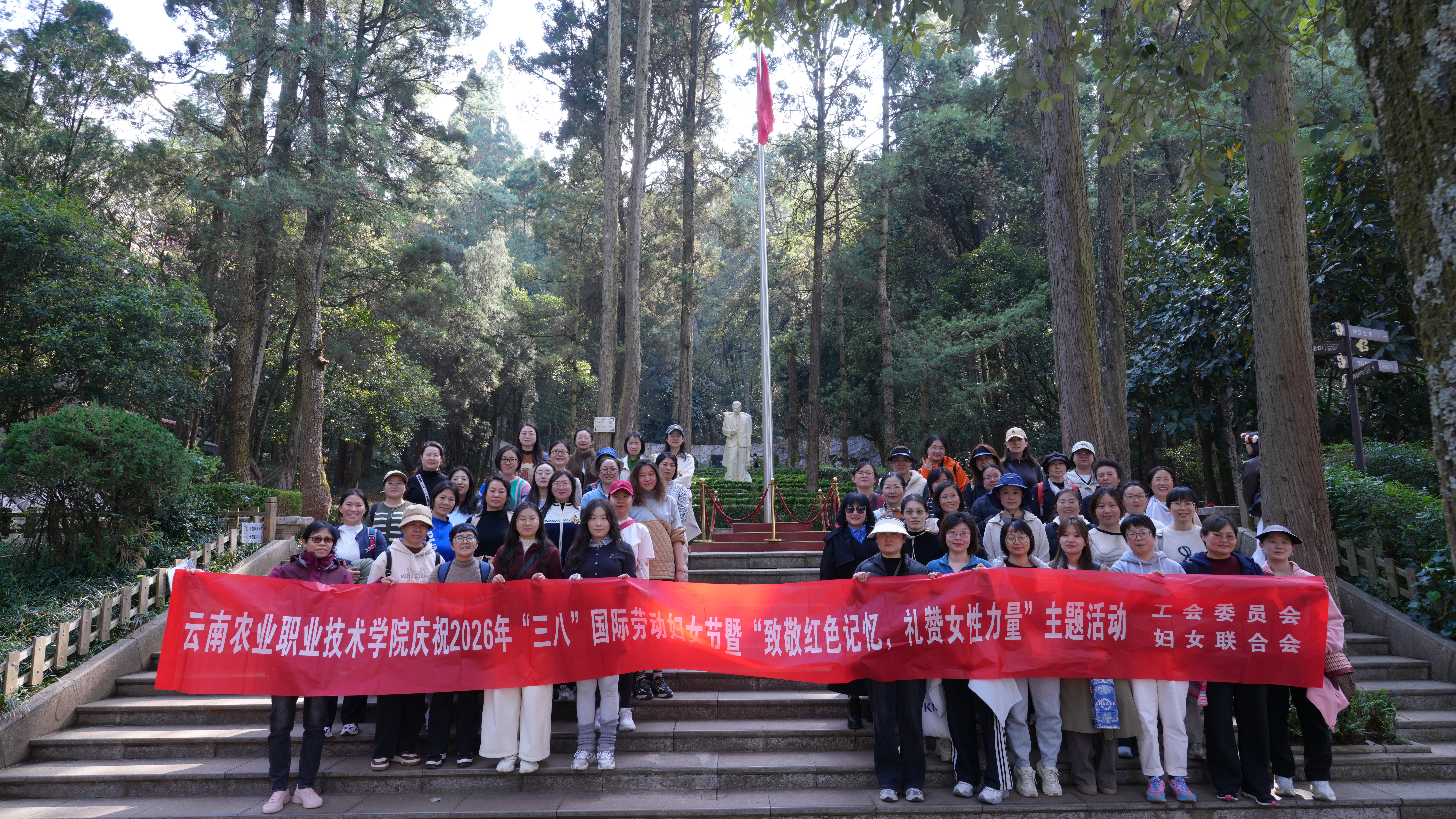在“三八”国际劳动妇女节即将来临之际,为进一步丰富女职工精神文化生活,增强团队凝聚力,同时传承红色基因、厚植爱国情怀,3月4日,学校工会委员会、妇女联合会组织全体女职工前往昆明西山公园,开展“致敬红色记忆 礼赞女性力量”主题活动,在亲近自然、锤炼意志的同时,接受深刻的爱国主义教育。
