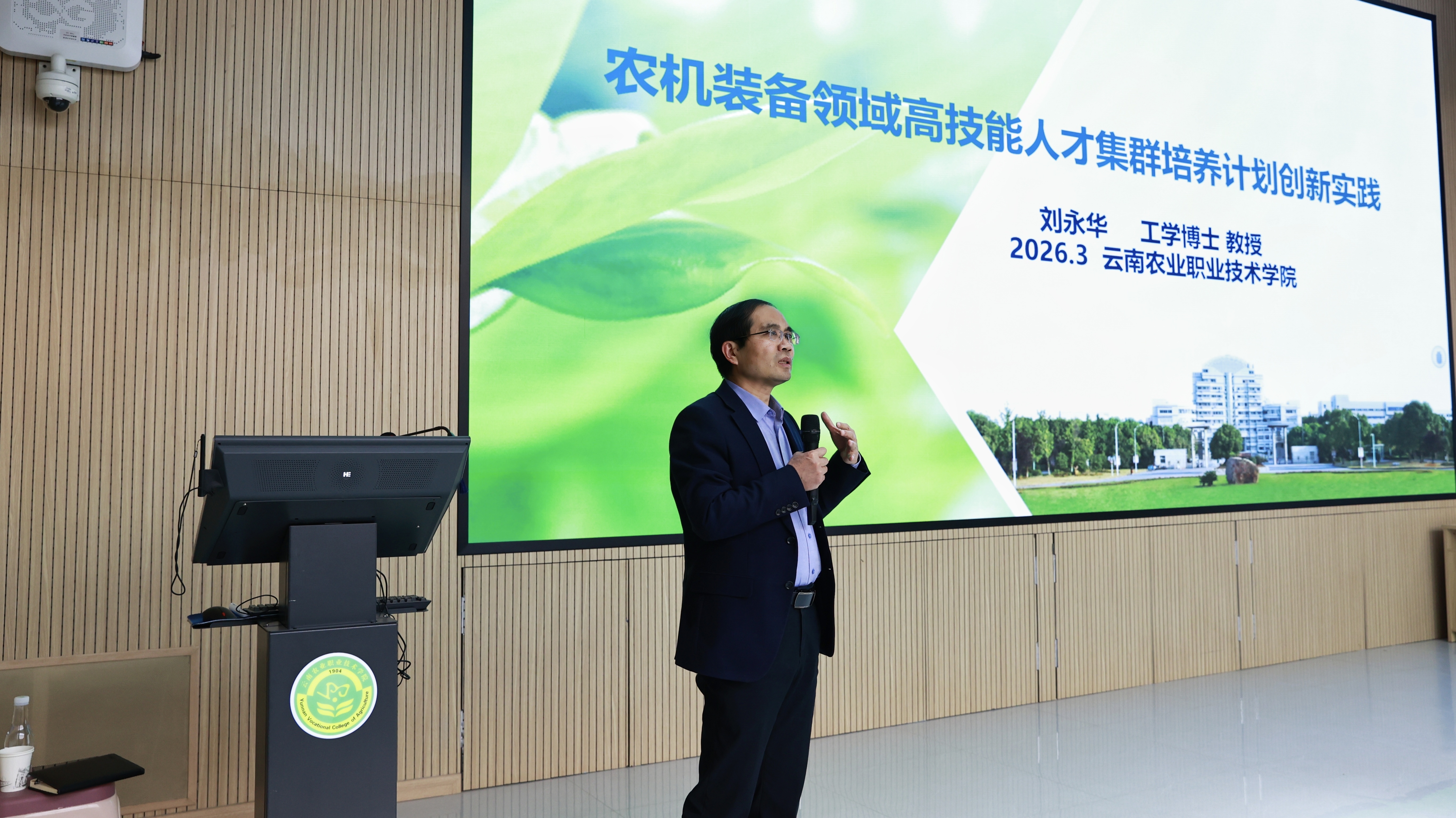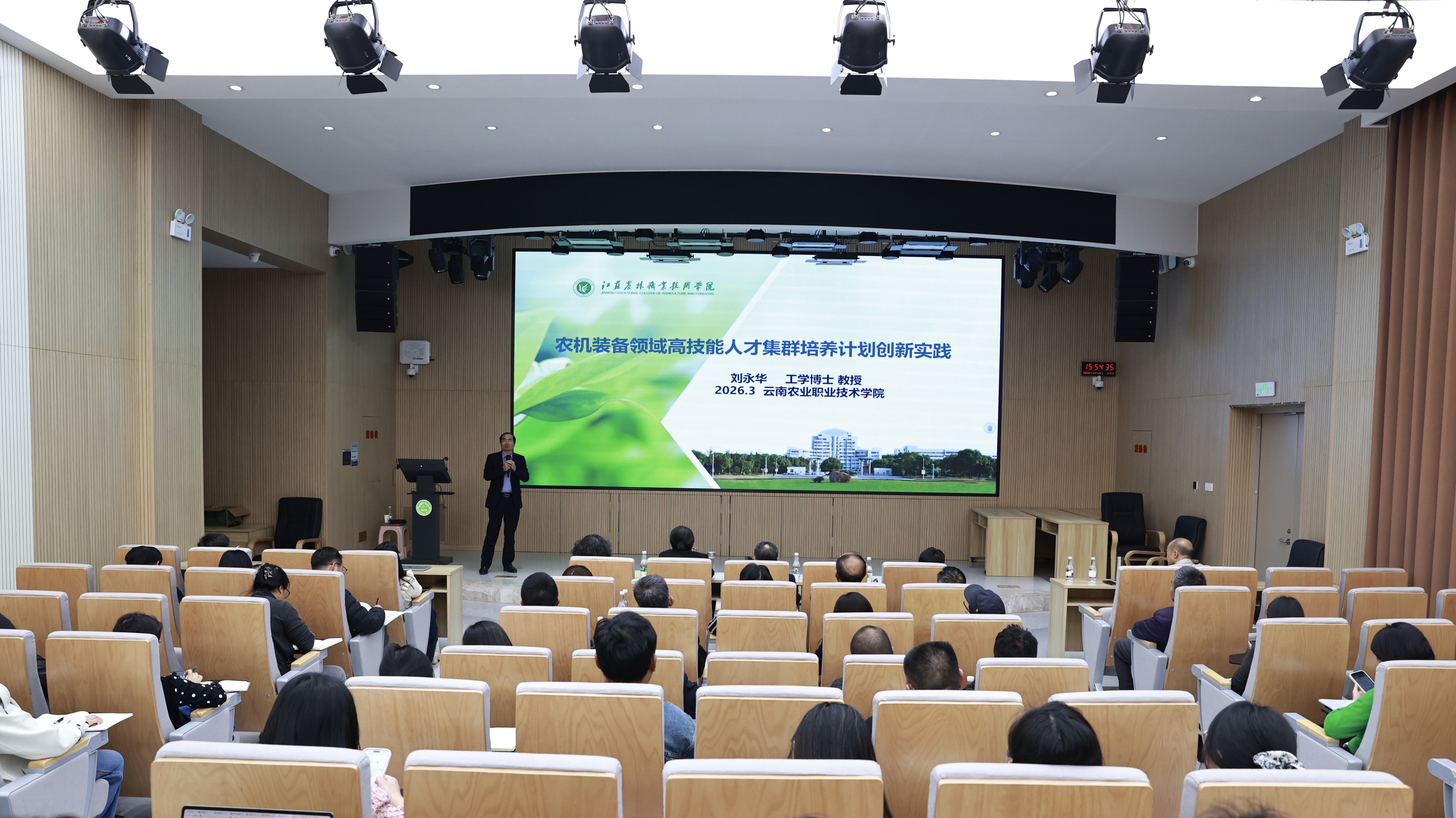 3月25日下午,江苏农林职业技术学院机电工程学院刘永华教授应邀做客我校2026年第4期“云农匠心”大讲堂,以“农机装备领域高技能人才集群培养创新实践”为题开展交流辅导。讲座由校长陈太安主持,副校长盛冀萍、银龄特聘教授、二级学院行政负责人,以及专业建设与教学管理等有关人员参加。