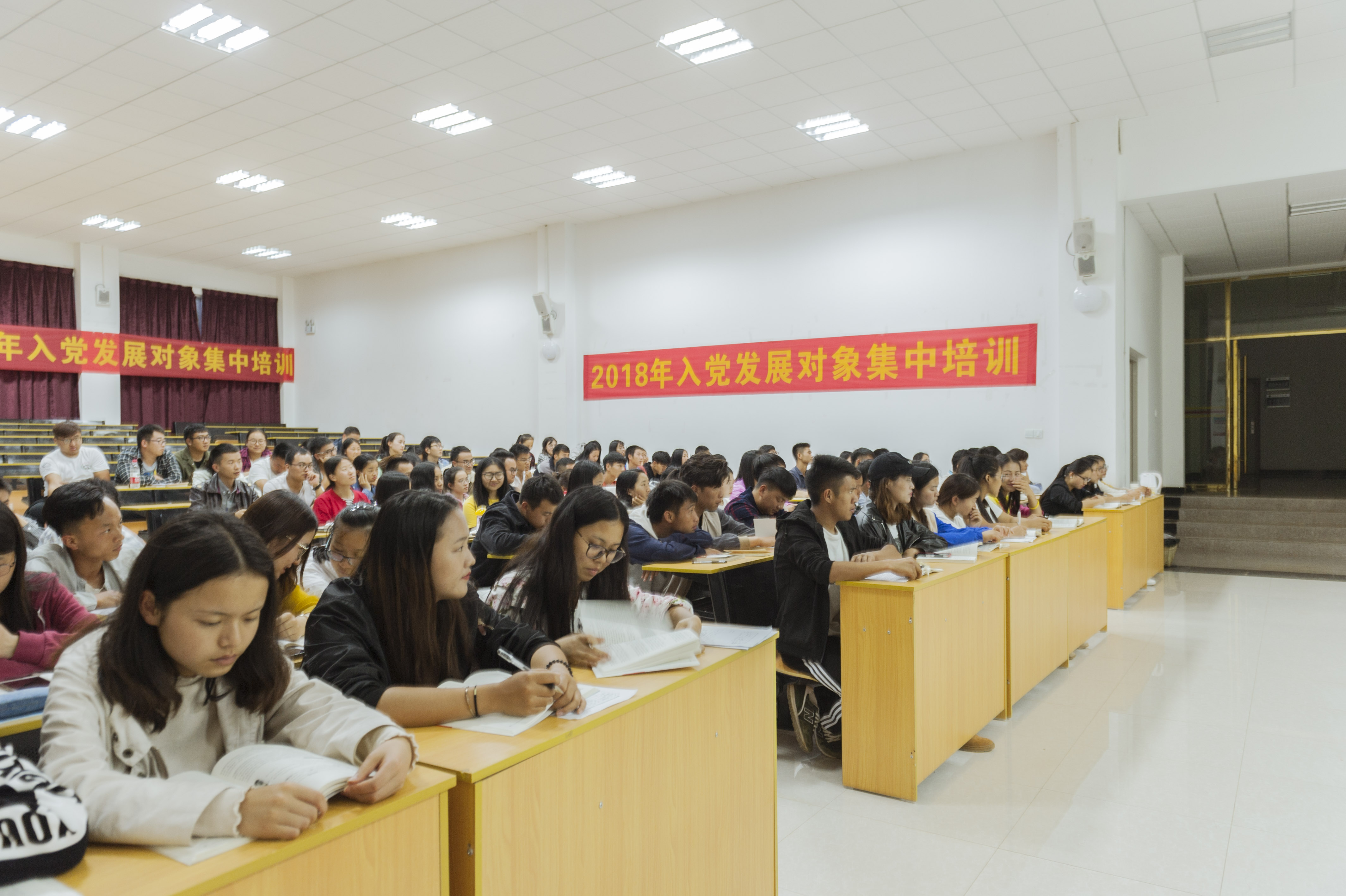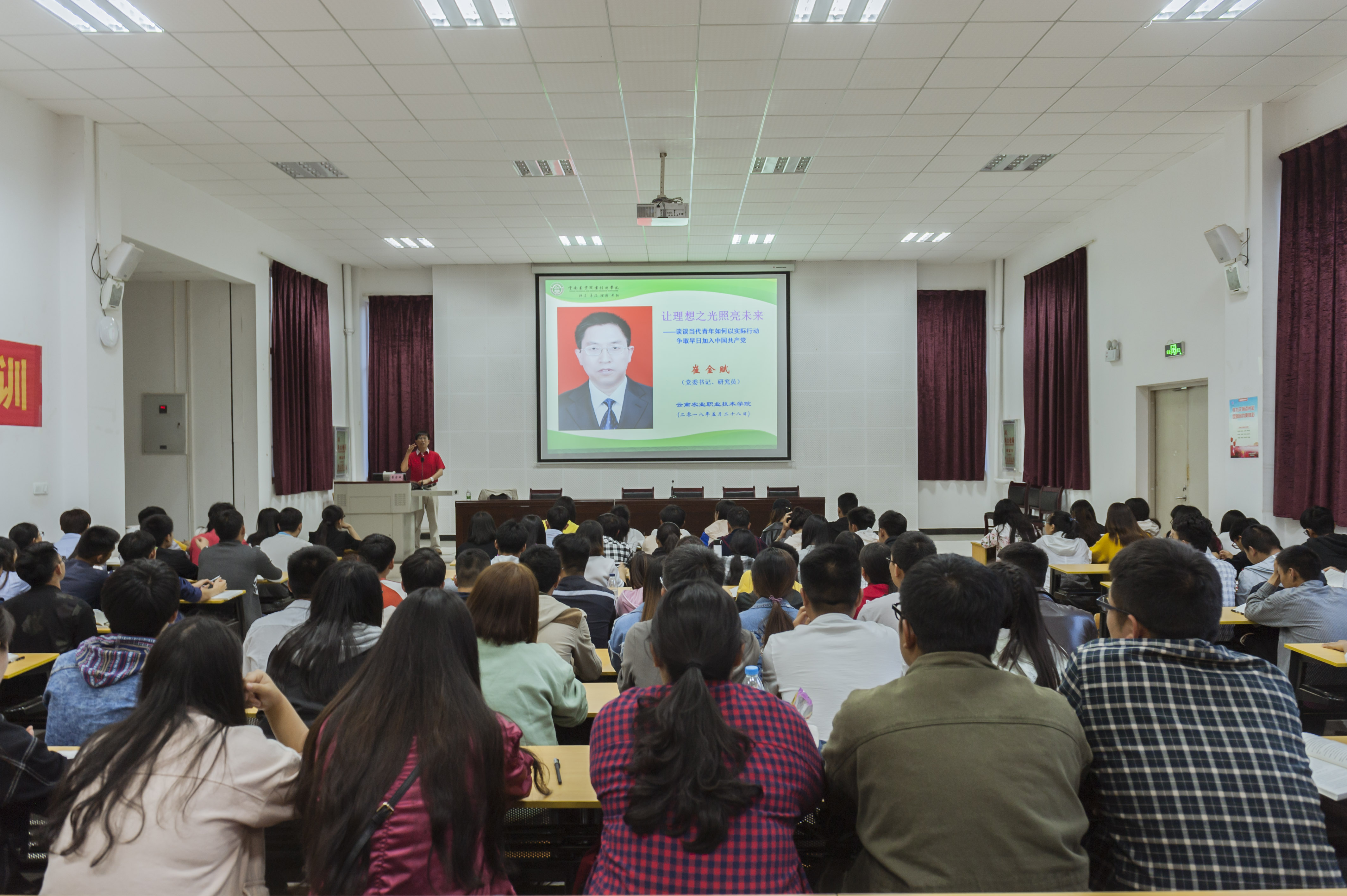 2018年5月28日晚19:40,在学院综合楼阶梯教室,学院党委书记、党校校长崔金赋同志为来自5个二级学院党总支部选送的全体入党发展对象讲授了一堂意义深刻的党课。